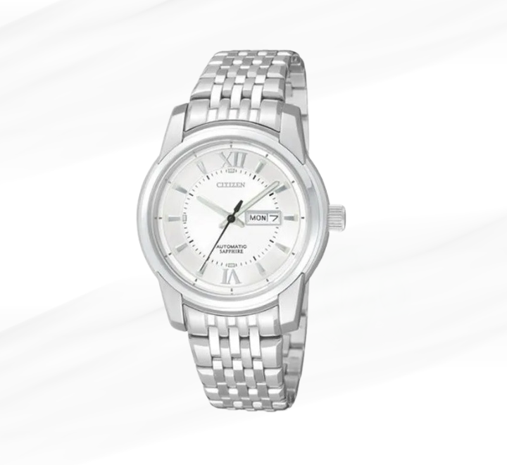 The Citizen PD3427-54A is a sophisticated women’s automatic dress watch featuring a white dial, day and date display, and a sleek stainless steel band. With its 100-meter water resistance and sapphire glass, this timepiece combines style with reliability.